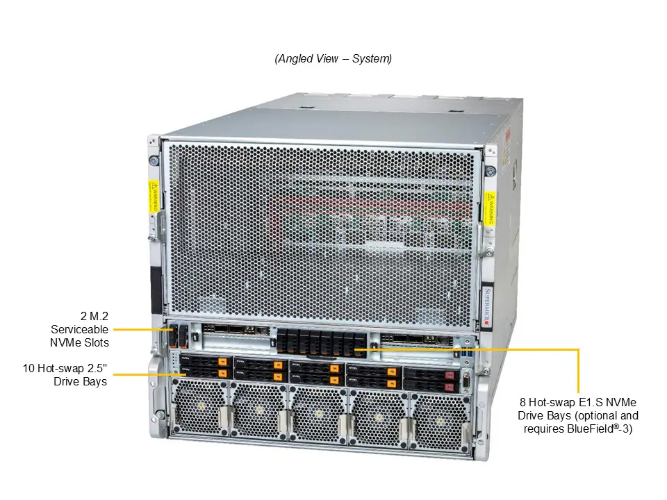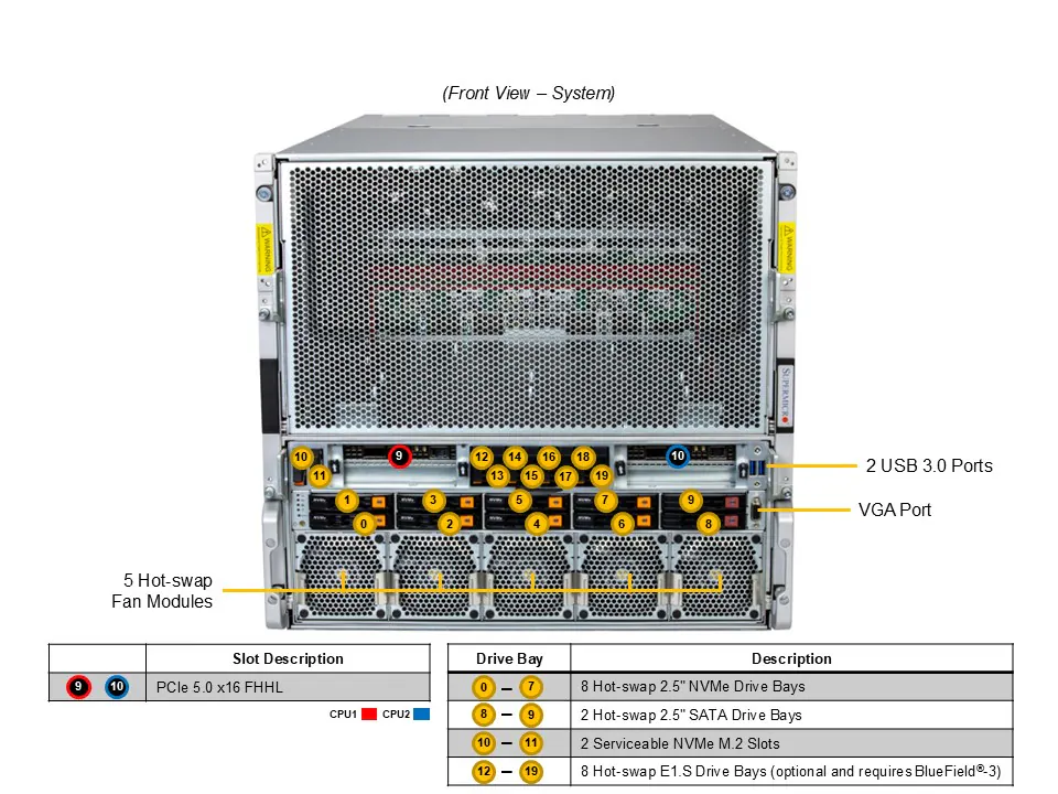 Drive Bays Configuration | Default: Total 10 bays 8 front hot-swap 2.5" PCIe 5.0 x4 NVMe drive bays 2 front hot-swap 2.5" SATA drive bays Option A: Total 8 bays (8 front hot-swap E1.S NVMe drive bays) (*NVMe support may require additional storage controller and/or cables) |