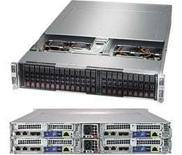 Key Features - Compute Intensive Application - HPC, Data Center, Enterprise Server - Hyperscale / Hyperconverged Four hot-pluggable systems (nodes) in a 2U form factor. Each node supports the following:1. Dual Socket P (LGA 3647) support 2nd Gen Intel® Xeon® Scalable processors (Cascade Lake/Skylake)‡2. 24 DIMMs; up to 6TB 3DS ECC DDR4-2933MHz† RDIMM/LRDIMM, Supports Intel® Optane™ DCPMM††3. 2 PCI-E 3.0 x16 (LP) slot; 1 SIOM card support (flexible networking) Note: must bundle with Network card4. 6 Hot-swap 2.5" SATA3 drive bays5. IPMI 2.0 + KVM with dedicated LAN6. Video via Aspeed AST2500 BMC7. 4 Heavy duty 8cm PWM fans with air shroud8. 2200W Redundant Power Supplies Titanium Level (96%) ![]() |