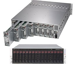 Key Features (per node) Cloud Computing Web Cache Web Hosting, VM Social Networking Corporate-WINS, DNS, Print, Login 1. Single socket H4 (LGA 1151) supports Intel® Xeon® processor E-2100/E-2200, 8th Gen. Intel® Core™ i3 Processors, Intel® Celeron®, Intel® Pentium®2. Intel® C246 chipset3. Up to 128GB unbuffered ECC, up to DDR4-2666MHz; 4 DIMM slots4. 1 PCI-E 3.0 x8 LP slot, 1 Micro-LP slot (MicroLP upgradable)5. 2x 3.5" SATA3 drives or 2x 2.5" SATA3 w/ optional kits6. M.2 Interface: 2 PCI-E 3.0 x4 M.2 Form Factor: 2280, 22110 M.2 Key: M-Key7. 2 GbE LAN ports via Intel i3508. Aspeed AST2500 graphics9. 4x 8cm Heavy duty fans with optimal cooling zone10. 2000W Redundant power supplies Titanium Level Certified (per system) ![]() |