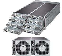 Key Features 8 Hot-plug System Nodes in 4U Each node supports: 1. Dual socket R3 (LGA 2011) supports Intel® Xeon® processor E5-2600 v4†/ v3 family; QPI up to 9.6GT/s2. Up to 1TB† ECC 3DS LRDIMM , up to DDR4- 2400†MHz ; 8x DIMM slots3. 1x PCI-E 3.0 x16 (LP) slot4. I/O ports: 2 GbE ports, 1 Built-in video, 2 USB 3.0 ports5. Built-in Server management tool (IPMI 2.0, KVM/media over LAN) with dedicated LAN port6. 2x 3.5" Fixed SATA HDD Bays7. 1620W Redundant Power Supplies Platinum Level (94%)8. 17cm Rear Fans (2x total) ![]() |