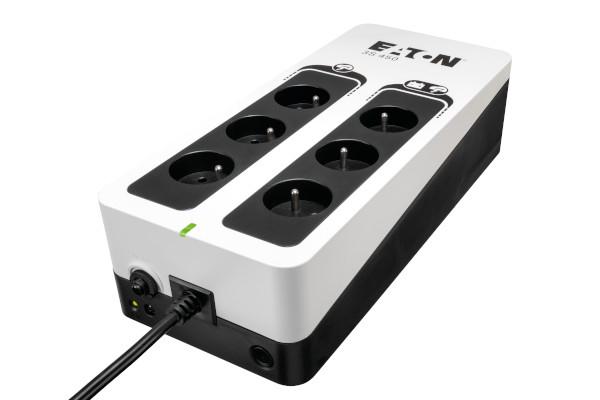 Eaton 3S450F. UPS-topologie: Stand-by (Offline), Output power capacity: 0,45 kVA, Uitgangsvermogen: 270 W. Stopcontacttypes: Type E, Aantal AC uitgangen: 6 AC-uitgang(en). Batterijtechnologie: Sealed Lead Acid (VRLA). Kleur van het product: Zwart, Wit, Snoerlengte: 1,5 m. Certificering: CE/EAC/Ukr/Cm/CB report