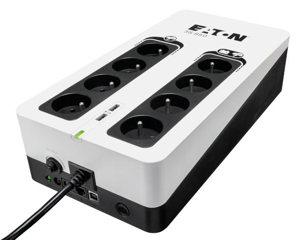 Eaton 3S850F. UPS-topologie: Stand-by (Offline), Output power capacity: 0,85 kVA, Uitgangsvermogen: 510 W. Stopcontacttypes: Type E, Aantal AC uitgangen: 8 AC-uitgang(en). Batterijtechnologie: Sealed Lead Acid (VRLA). Kleur van het product: Zwart, Wit, Snoerlengte: 1,5 m. Certificering: CE/EAC/Ukr/Cm/CB report