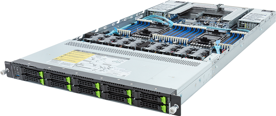 GIGABYTE R183. Chipset moederbord: Intel C741, Processor socket: LGA 4677 (Socket E), Processorfabrikant: Intel. Ondersteunde geheugen types: DDR4-SDRAM, Ondersteunend DIMM module capaciteiten: 16GB, 32GB, 64GB, 128GB, Ondersteunende RDIMM klok snelheden: 2933,3200 MHz. Opslagschijf afmetingen ondersteund: 2.5". On-board graphics adapter model: Aspeed AST2500. Ethernet interface type: Gigabit Ethernet, Ethernet LAN, data-overdrachtsnelheden: 10,100,1000 Mbit/s, LAN controller: Intel® I350-AM2