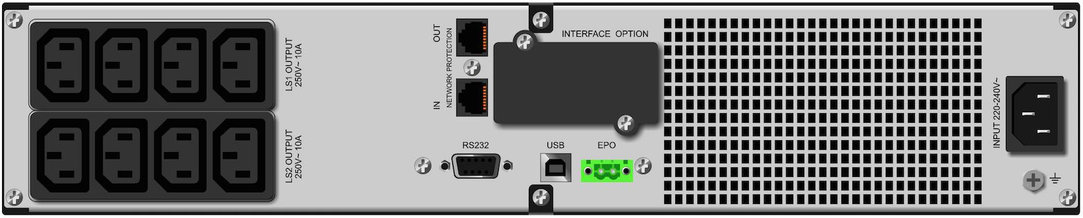 NEXT UPS Systems Mantis II 3000 RT2U NETPACK. UPS-topologie: Line-interactive, Output power capacity: 3 kVA, Uitgangsvermogen: 2700 W. Stopcontacttypes: C13 stekker, C19 stekker, Aantal AC uitgangen: 9 AC-uitgang(en). Batterij capaciteit: 9 Ah, Accu/Batterij voltage: 12 V, Accu/Batterij oplaadtijd: 3 uur. Vormfactor: Rackmontage/toren, Kleur van het product: Zwart, Rackcapaciteit: 2U. Breedte: 86,5 mm, Diepte: 438 mm, Hoogte: 608 mm