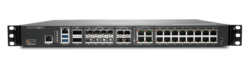 SonicWall NSSP 11700. Firewall-doorvoersnelheid: 47 Gbit/s, VPN-doorvoersnelheid: 26,7 Gbit/s, IPS/IDS throughput: 37000 Mbit/s. Warmtedissipatie: 529,57 BTU/h. Ondersteunde beveiligingsalgoritmen: 3DES, MD5, 128-bit AES, DES, 192-bit AES, SHA-1, 256-bit AES, SHA-256, SHA-384, SHA-512. Beheerprotocollen: CLI, SSH, Web UI, REST APIs, Ondersteunde netwerkprotocollen: BGP4, OSPF, RIPv1/ v2, static routes, policy‑based routing. Beheerplatform: SonicOS 7.0.1