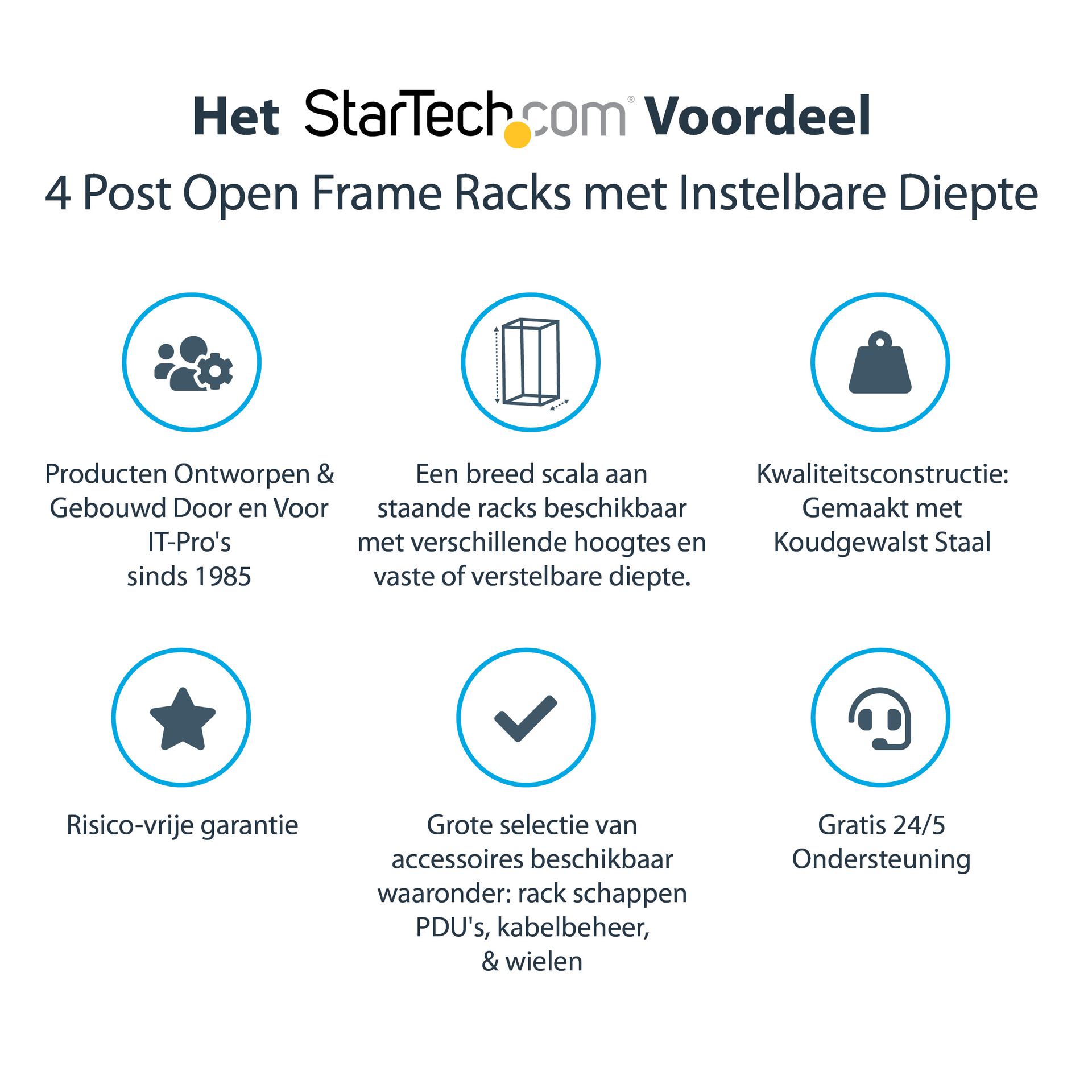 StarTech.com 4-Post 25U Mobiel Open Frame Server Rack, 19" Patchkast met Wielen en 4 Stijlen, Open Serverkast met Verstelbare Diepte voor Computer / AV / Netwerk Apparatuur - Wielen, Stelvoeten of Vloermontage. Soort: Vrijstaande rek, Rackcapaciteit: 25U, Maximale gewichtscapaciteit: 544,3 kg, Verbeterd kabelbeheer, Zwenkwieltjes. Gewicht: 33 kg. Kleur van het product: Zwart