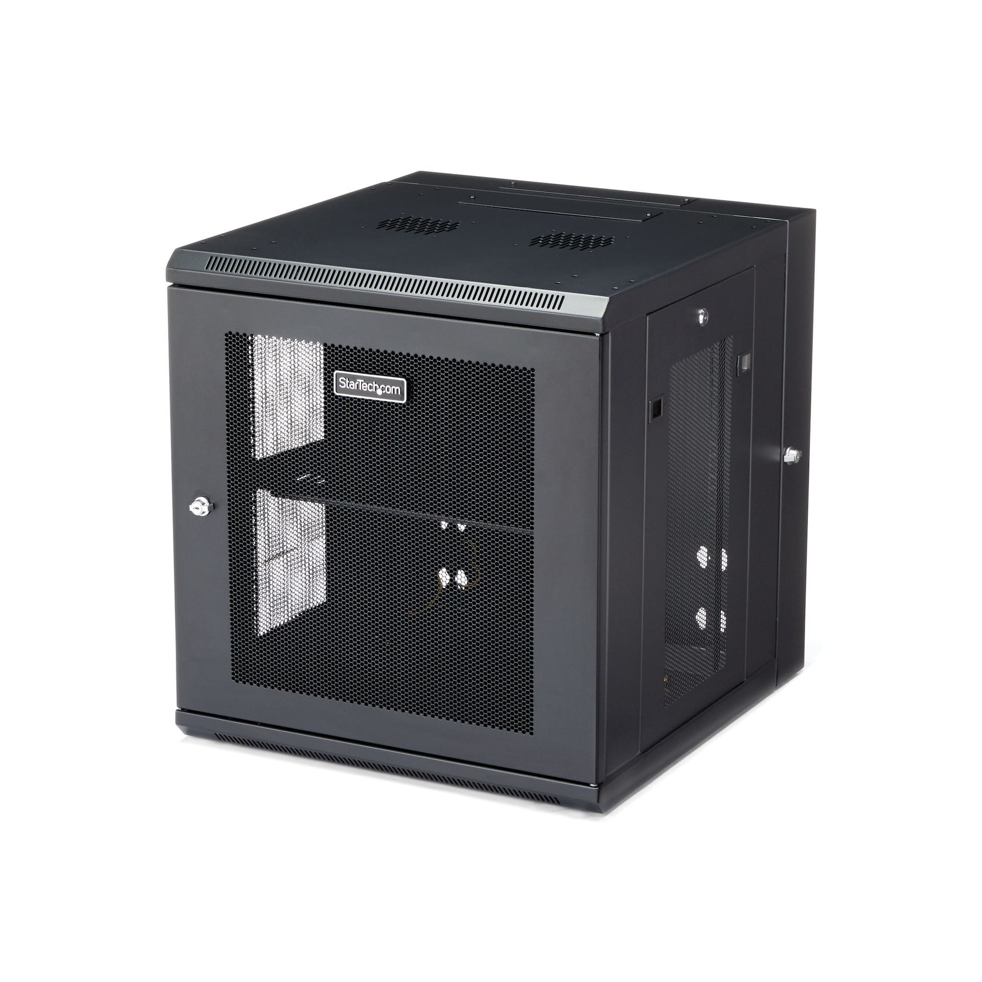 StarTech.com 4 Post 12U Wandmonteerbare Netwerkkast met 1U Schap, 19" Scharnierende Patchkast voor Data/AV/Electronica/Computer Apparatuur, Veelzijdig Geventileerd Server Rack, Vergrendelbaar. Soort: Wandrek, Rackcapaciteit: 12U, Maximale gewichtscapaciteit: 90 kg, Sleutelsleuf, Verbeterd kabelbeheer. Gewicht: 37,4 kg. Kleur van het product: Zwart
