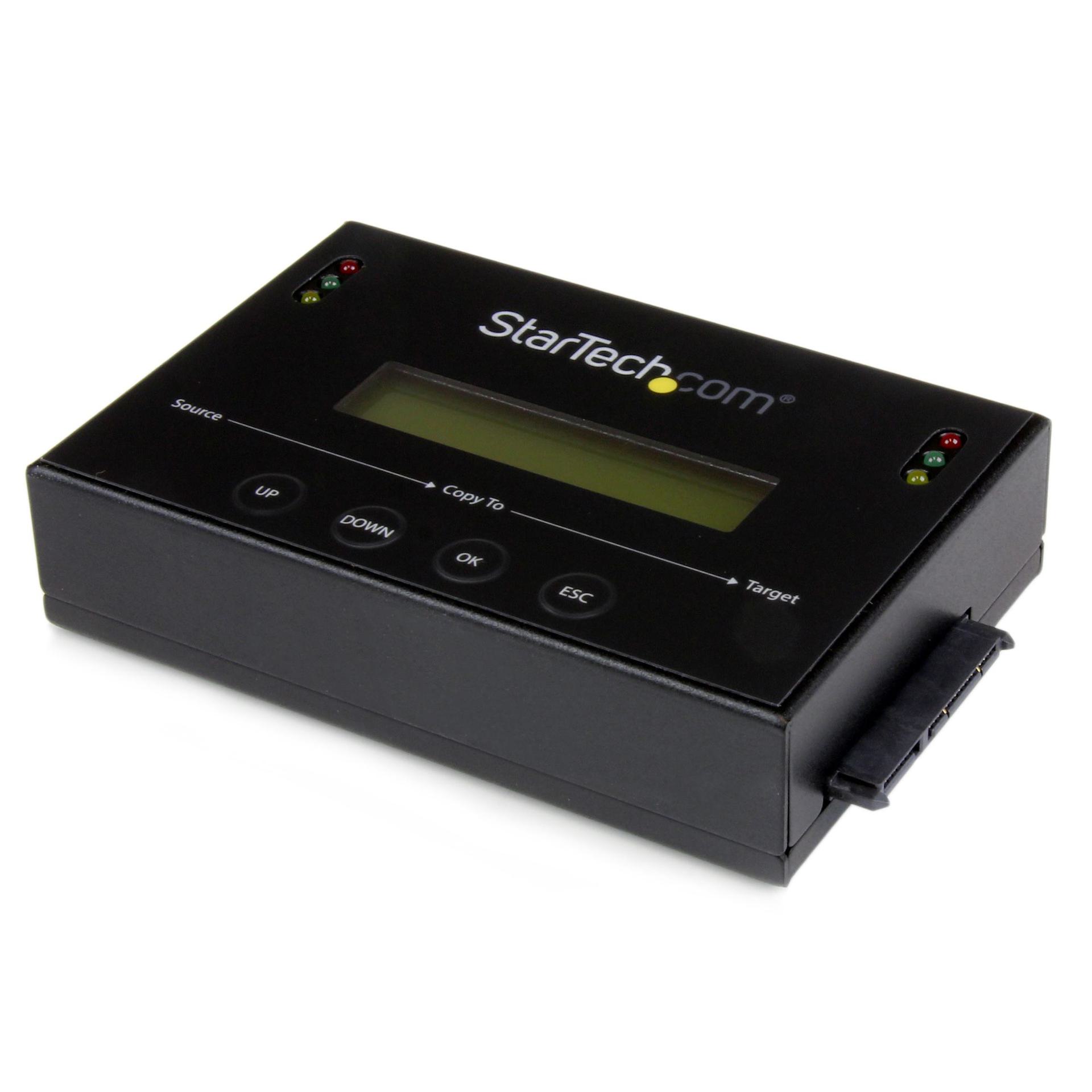 StarTech.com 1:1 Standalone Hard Drive Cloner met Multi Disk Image Manager voor Backup en Restore, Meerdere Disk Images opslaan op een 2.5/3.5" SATA Drive, HDD/SSD Kloner, Geen PC vereist. Type product: HDD/SSD-duplicator, Interface: SATA, Kleur van het product: Zwart. Ondersteunde HDD-groottes: 2.5,3.5", Ondersteunde HDD aansluitingen: SATA, SATA II, SATA III. Stroomverbruik (typisch): 60 W, AC-ingangsspanning: 100 - 240 V, Stroom: 1.4 A. Afmetingen (B x D x H): 77 x 129 x 28 mm, Gewicht: 350 g. Breedte verpakking: 185 mm, Diepte verpakking: 267 mm, Hoogte verpakking: 119 mm