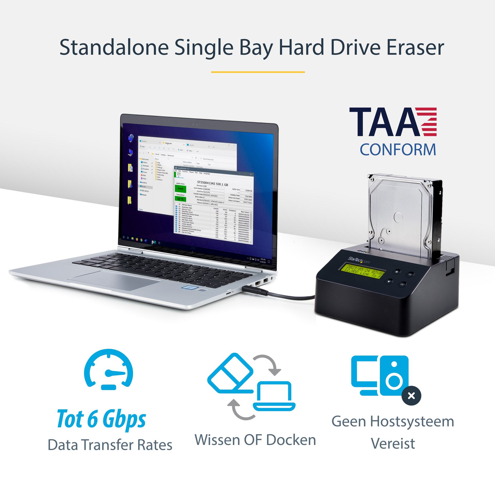 StarTech.com Single Bay Hard Drive Wisser, Standalone HDD/SSD Sanitizer/Eraser, 4Kn, USB 3.0 naar SATA III (6 Gbps), 9 Wismodi, LCD Display, Hard Disk Secure Erase Dock, DB-9 Printer Poort, TAA Compliant. Type product: HDD/SSD-duplicator, Aantal gelijktijdige kopien: 1 kopieën, Interface: USB 3.2 Gen 1 (3.1 Gen 1). Ondersteunde HDD-groottes: 2.5,3.5". Netvoeding: 60 W, AC-ingangsspanning: 110 - 240 V, Stroom: 1.4 A. Afmetingen (B x D x H): 123 x 140 x 70 mm, Gewicht: 656 g. Breedte verpakking: 183 mm, Diepte verpakking: 372 mm, Hoogte verpakking: 90 mm