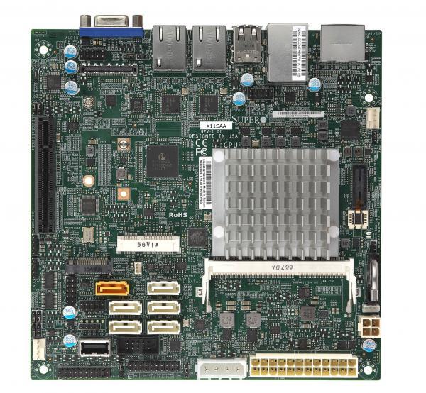Supermicro X11SAA. Processorfabrikant: Intel, Processor socket: BGA 1296. Ondersteunde geheugen types: DDR3-SDRAM, Maximum intern geheugen: 8 GB, Geheugen voltage: 1.35 V. On-board graphics adapter model: Intel® HD Graphics. Ethernet interface type: Gigabit Ethernet, LAN controller: Intel® I210-AT. Moederbord form factor: Mini-ITX