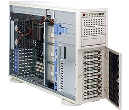 Key Features 1. Two Six-Core AMD Opteron 2000 Series (Socket F) processor support; HT3.0 Link support2. Up to 128GB DDR2 800/667/533 SDRAM; 16 DIMM Sockets3. 2 x8 PCI-e, 2 64-bit 133/100MHz PCI-X, 2 64-bit 100MHz PCI-X4. nVidia MCP55 Pro / NEC uPD720400 Chipset5. 8 x 3.5" Hot-swap SATA Drive Bays6. Dual-port Gigabit LAN/Ethernet Controller7. 800W Redundant Power Supply |