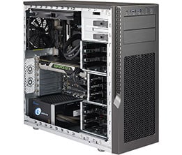 Supermicro SuperServer 5130AD-T. Type behuizing: Mid-Tower, Type product: Barebone werkstation. Chipset moederbord: Intel Z270 Express, Processor socket: LGA 1151 (Socket H4), BIOS type: EEPROM. Ondersteunde geheugen types: DDR4-SDRAM, Aantal geheugenslots: 4, Maximum intern geheugen: 64 GB. Ondersteunde types opslag-drives: HDD & SSD, Soorten RAID: 0, 1, 5, 10. Aantal Ethernet LAN (RJ-45)-poorten: 2. Type koeling: Actief. Netvoeding: 750 W